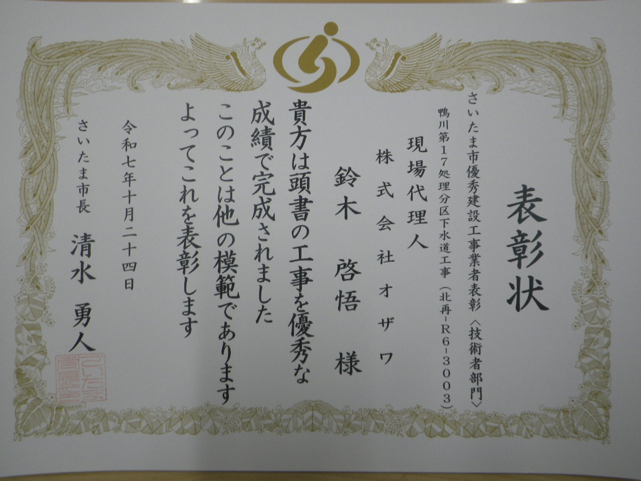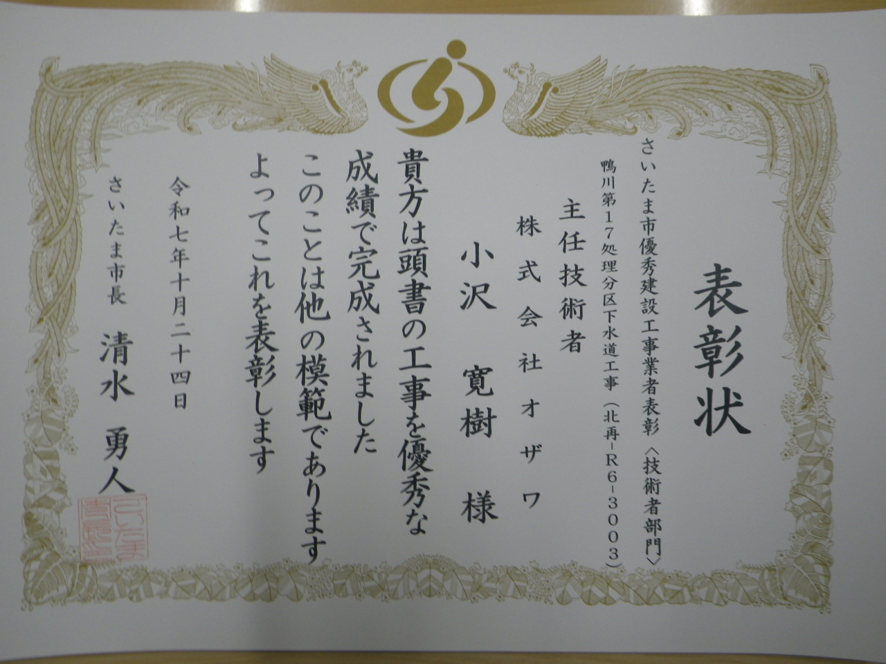 令和7月10月 さいたま市優秀建設工事業者表彰(技術者部門)を受賞しました。