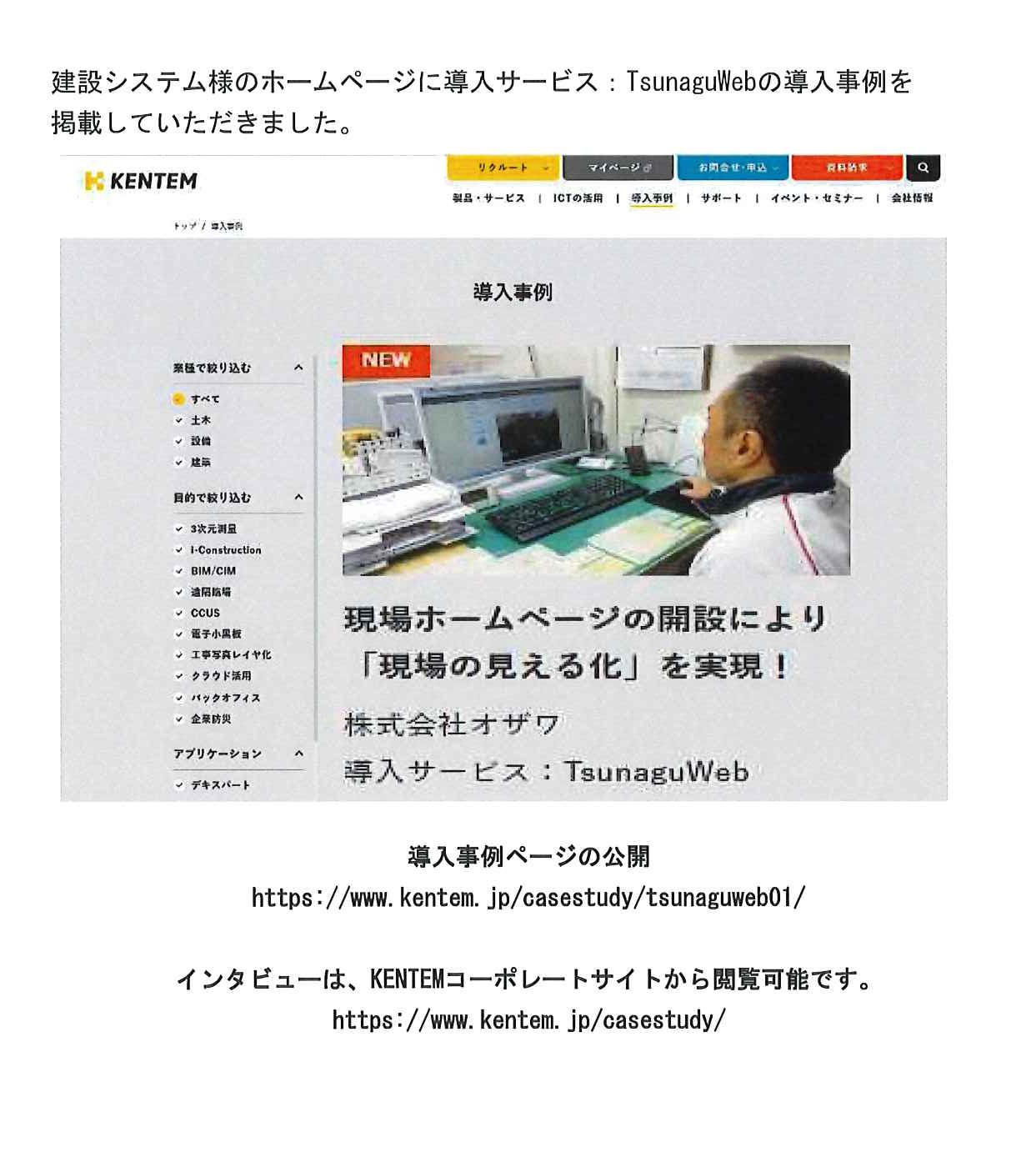 令和8年3月 建設システム様のホームページにTsunaguWebの導入事例を掲載していただきました。